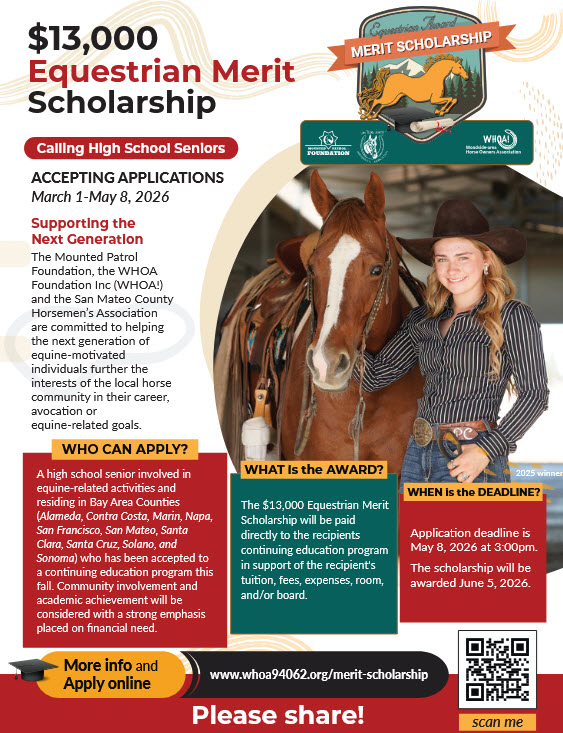 This year the San Mateo County Horsemen's Association (SMCHA) joins The Mounted Patrol Foundation (MPF) and the Woodside-area Horse Owners Association (WHOA!) to sponsor the $13,000 Equestrian Merit Scholarship to a high school senior involved in equine-related activities and residing in Bay Area Counties (Alameda, Contra Costa, Marin, Napa, San Francisco, San Mateo, Santa Clara, Santa Cruz, Solano, and Sonoma) who has been accepted to and plans to attend a college, university, trade school or other continuing education program each fall